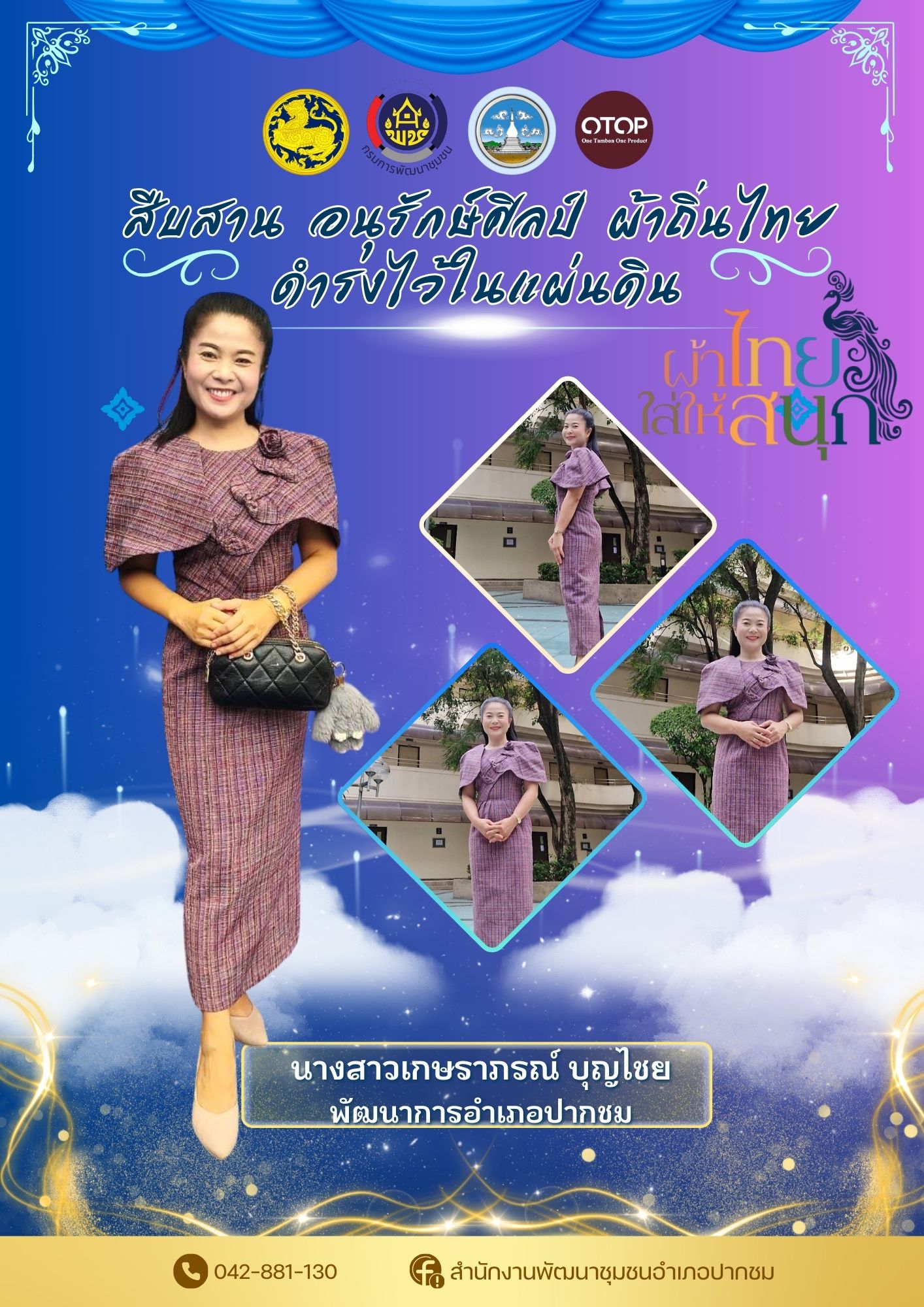พช.ปากชม รณรงค์การใช้และสวมใส่ผ้าไทย "ผ้าไทยใส่ให้สนุก" นางแบบผ้าไทยในวันนี้ คือ นางสาวเกษราภรณ์ บุญไชย พัฒนาการอำเภอปากชม สำนักงานพัฒนาชุมชนอำเภอปากชม ประชาสัมพันธ์เชิญชวนหัวหน้าส่วนราชการ องค์กรปกครองส่วนท้องถิ่น เครือข่าย OTOP องค์กรสตรี เครือข่ายพัฒนาชุมชน ร่วมสวมใส่ผ้าไทย เพื่อขับเคลื่อนสู่การสืบสานอนุรักษ์ศิลป์ผ้าถิ่นไทย ดำรงไว้ในแผ่นดิน "ผ้าไทยใส่ให้สนุก" ตามพระดำริสมเด็จพระเจ้าลูกเธอ เจ้าฟ้าสิริวัณณวรี นารีรัตนราชกัญญา และตามมติ ครม. เมื่อวันที่ 9 มิถุนายน 2563 ส่งเสริมและสนับสนุนการใช้และสวมใส่ผ้าไทย "ผ้าไทยใส่ให้สนุก"