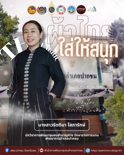 สำนักงานพัฒนาชุมชนอำเภอปากชม ขอชวนชาวปากชม “ภูมิใจแต่งไทยทั้งแผ่นดิน” ย้ำพลังวัฒนธรรมไทยสู่เวทีโลก มามิกซ์แอนด์แมตช์ผ้าไทยในสไตล์ของตัวเอง เติมสีสันให้การแต่งกายด้วยผ้าไทย ใส่ได้หลากหลายโอกาส ทั้งวันทำงาน วันสบาย ๆ หรือวันสำคัญ สวมใส่แล้วดูดี มีเอกลักษณ์ และสะท้อนความเป็นไทยอย่างลงตัว