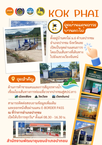 หมายเหตุ : สามารถติดต่อสอบถามข้อมูลการข้ามพรมแดนเพิ่มเติม และออกหนังสือผ่านแดน E-BORDER PASS ณ ที่ว่าการอำเภอปากชม เปิดให้บริการทุกวัน* ตั้งแต่ 08.30 - 16.30 น.